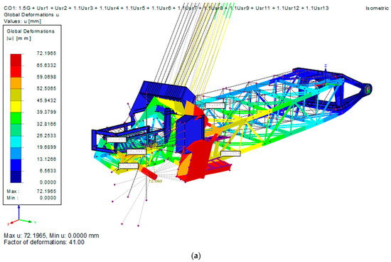 Looking at the static analysis part, we considered the case of the action of the combination of loads (CO1) in which they are included together with the masses of the subassemblies and the maximum actuation moment of the bucket wheel for a case in which the overload coupling can put the machine out of use. Overload coefficients are given by DIN 22261/2 [33] for each type of load. After calculating (using the finite element method) the three considered situations (Figure 12), we determined the first ten natural frequencies for the bucket wheel arm, as well as the static displacements, which are presented in Table 2. The dynamic deformed shapes for the first natural frequency and the static displacements of a point located on the cup wheel shaft are also graphically illustrated in Figure 13.