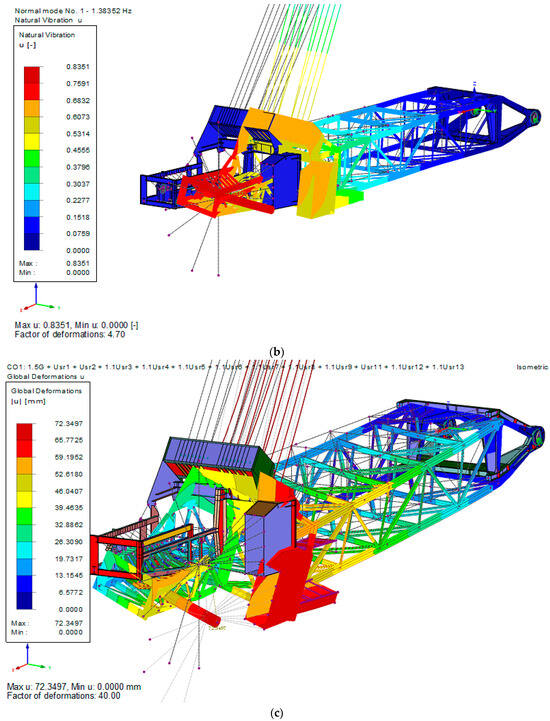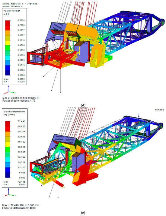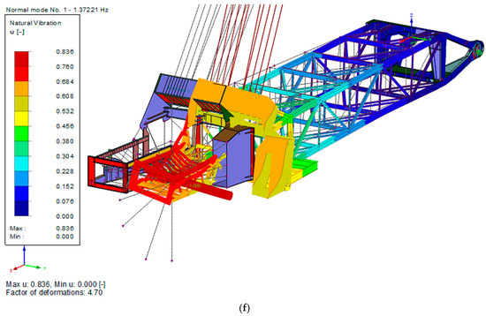 The dynamically and statically deformed shape of the bucket wheel arm: (a) Case 1, static, load case CO1 for corrosion degradation, D = 0 mm; (b) Case 1, dynamic, vibration mode I—1.384 Hz, for corrosion degradation, D = 0 mm; (c) Case 2, static, load case CO1 for corrosion degradation, D = 3 mm; (d) Case 2, dynamic, vibration mode I—1.376 Hz, for corrosion degradation, D = 3 mm; (e) Case 3: static, load case CO1 for corrosion degradation, D = 4.5 mm; (f) Case 3, dynamic, vibration mode I—1.372 Hz, for corrosion degradation, D = 4.5 mm (Legend of the Panel (natural vibration u [-]): This refers to the vibration mode of the structure. The coloured values represent the relative amplitude of the modal deformation for each point in the structure. 1.0000 (Red): Indicates points with the highest amplitude of modal deformation; 0.0000 (Dark Blue): Indicates points with the lowest amplitude of modal deformation).