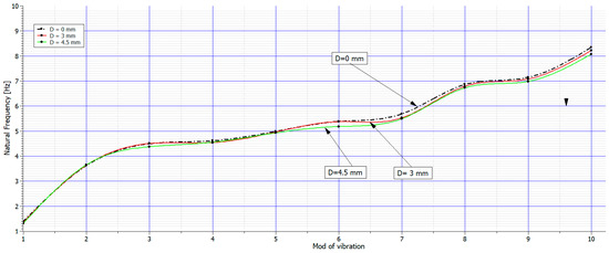 From the point of view of the graphical representation, in the case of vibration mode I, we have the following values for the first ten natural frequencies: fnD0 = 1384 Hz, fnD3 = 1376 Hz, and fnD4.5 = 1372 Hz. It can be seen from the 2D graph (Figure 13) that the deformed shapes of the graphs for corrosion damage D.3 mm and D.4.5 mm, respectively, preserve the deformed shapes of the initial natural frequencies D.0, the differences being very small in value.