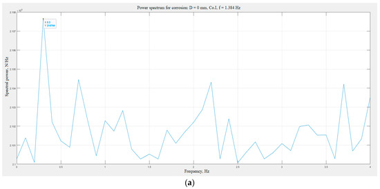The power spectral plot represents the distribution of signal energy as a function of frequency and provides insight into the frequency components of the signal. Figure 14 shows the spectral power graphs and the spectral power of the dominant frequencies for the three cases.