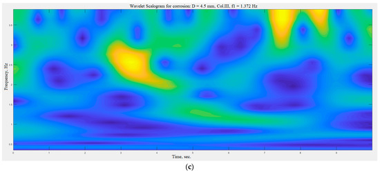 Scalograms of the wavelet analysis for: (a) D = 0 mm, f1 = 1.384 Hz; (b) D = 3 mm, f1 = 1.376; (c) D = 4.5 mm, f1 = 1.372.