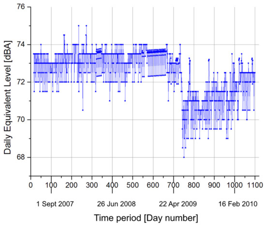 The time history of the actual 1087 data used for the comparison in the calibration phase. The related period is between 24 May 2007 and 14 May 2010. On the x-axis, timespan is reported, while on the y-axis, LAeq,16 h, expressed in dBA, are present.