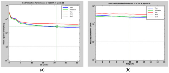 Performance achieved during the calibration process of the ANN (t-1) model. For the first tuning, the figure on the left (a), the mean square error after 21 epochs is 0.30. For the second tuning, the figure on the right (b), the mean square error after 10 epochs is 0.25. Circles indicate the values at the selected epoch.