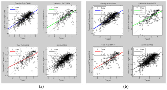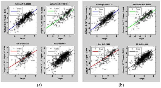 Regression lines after the training process of the ANN (t-7) model: the blue line is the fit on 60% of the training data, the green line is the fit on 20% of the validation data, and the red line is the fit on 20% of the test data. The dashed line is the bisector of the plot, where simulated data are equal to the real ones. The last plot is the regression fit on all 1087 data; the figure on the left (a) is relative to the first tuning, and the figure on the right (b) is relative to the second tuning.