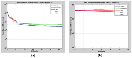 Performance achieved during the calibration process of the ANN (t-7) model. For the first tuning, the figure on the left (a), the mean square error after 22 epochs is 0.46. For the second tuning, the figure on the right (b), the mean square error after 2 epochs is 0.43. Circles indicate the values at the selected epoch.