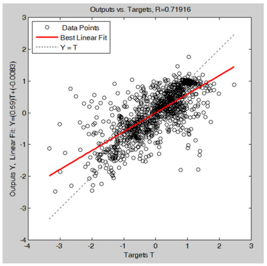 Again, two cycles were run, to minimize the objective function. In Figure 6, the results of the two training cycles are reported: the lowest value for the objective function is 0.46 for the first cycle and 0.43 for the second one. These results were achieved after 22 epochs in the first cycle and after 24 epochs in the second cycle. In Figure 7, the regression lines are shown: the correlation coefficient is 0.73 at the end of the first cycle and 0.74 after the second one. Thus, thanks to the weekly periodicity of the dataset, the network still has good predictive performances, even if the input vector includes data that are “one week old” compared to the considered day.