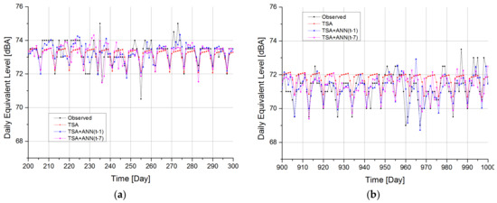 Analysis of the error of the three proposed models gives information on attitudes of the three strategies to forecast LAeq,16 h in periods not used in the calibration phase. In Figure 11a, it is easy to see that the DD-TSA model underestimates the real value of acoustic emission in every 100 periods of the performance test. To correct this wrong behavior, it may be advisable to recalculate the trend by cutting part of the oldest periods of the calibration series. The weekly periodicity of the series is reproduced with good approximation, but some emission peaks are not adequately predicted by the model because of the completely random nature of these events.