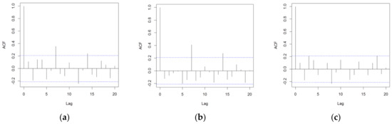 A correlogram of the errors for (a) the DD-TSA model, (b) the DD+ANN (t-1) model and (c) the DD+ANN (t-7) model, evaluated in the performance test phase (100 data). On the x-axis, lag is reported, and on the y-axis is the autocorrelation function.