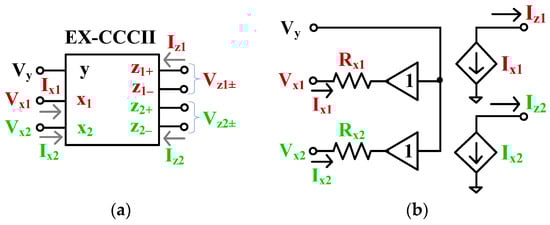 Figure 1a shows the symbolic representation of the EX-CCCII, and Figure 1b shows the equivalent circuit. From Figure 1b, it can be seen that this EX-CCCII has two intrinsic resistances,  and , on terminals x1 and x2, respectively. The characteristics of the EX-CCCII ports in Figure 1 are given by