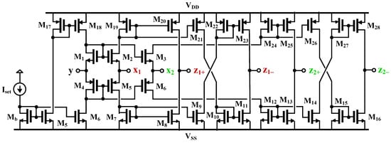 Figure 2 shows the structure of the CMOS EX-CCCII []. The transistors M1–M6 are connected in the so-called translinear loop configuration [], while transistors Mb, M7, M8, M19, M20, and the biasing current Iset provide the bias current required for the circuit. Assuming that the NMOS (M1–M3) and PMOS (M4–M6) transistors are matched (i.e.,  and ), and the transistors Mb, M5, M6, M17, and M18 are identical, the relationship  can be obtained and the intrinsic resistances at the x1- and x2-terminals ( and ), assuming operation in strong inversion, can be determined by []