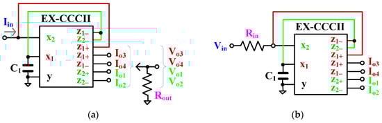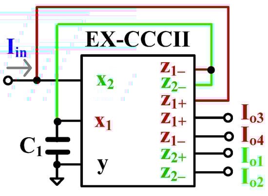 Current-mode circuits are usually implemented using second-generation current conveyors (CCII) [] as they offer a better dynamic range, bandwidth, and linearity compared to operational amplifiers (op-amp) [,]. The conventional CCII is a single-end active block, it has y-, x-, and z-terminals, and usually requires many passive components to realize applications. In order to overcome these limitations and extend the range of the CCII, other functional blocks have been proposed. Some examples are the differential difference current conveyor (DDCC) [] or the fully differential second-generation current conveyor (FDCCII) [], which enables arithmetic operations. Further examples include the dual-x second-generation current conveyor (DX-CCII) [] and the extra-x second-generation current conveyor (EX-CCII) [], which both provide multiple x- and z-terminals. The extra-x current controlled second-generation current conveyor (EX-CCCII) has also been proposed []. Compared to the EX-CCII, the EX-CCCII considers the intrinsic resistance at the x-terminal, which can be electronically controlled by a bias current. This is advantageous in applications because it can be used as a tuning parameter. Therefore, EX-CCCII-based circuits are able to be free of passive resistors while offering the possibility of electronic tuning.