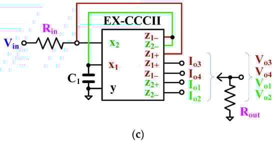 Figure 4c shows the proposed VM filter. In this case, the resistor  is used to convert the voltage input  to the current input  and the resistors  are used to convert the current outputs , , , and  to the voltage outputs , , , , , and . Using the transfer functions (3)–(6) of the current-mode filter, the output voltages of the VM filter can be expressed by