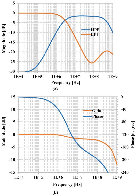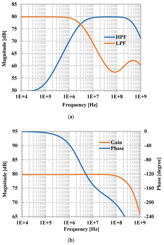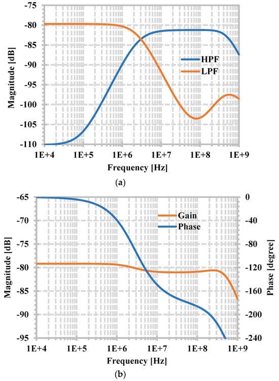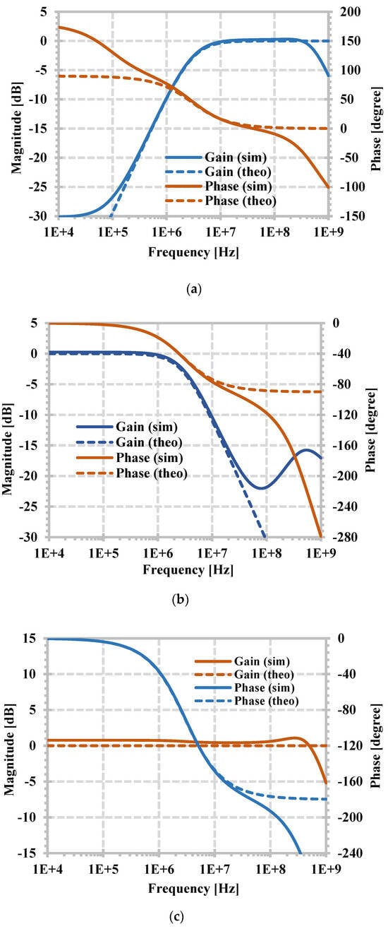 Figure 6 shows the simulated magnitude frequency responses of the HPF and LPF and the magnitude and phase frequency responses of the APF when the circuit was designed as  = 30 pF and  = 20 μA ( = 1.81 kΩ). The simulated pole frequency was 2.91 MHz, whereas the designed pole frequency was 2.93 MHz. The circuit consumed 0.558 mW of power, and the −3 dB bandwidth of the filter was 600 MHz. The theoretical value was used to confirm the simulation results, showing that the simulation results agree with the theory.