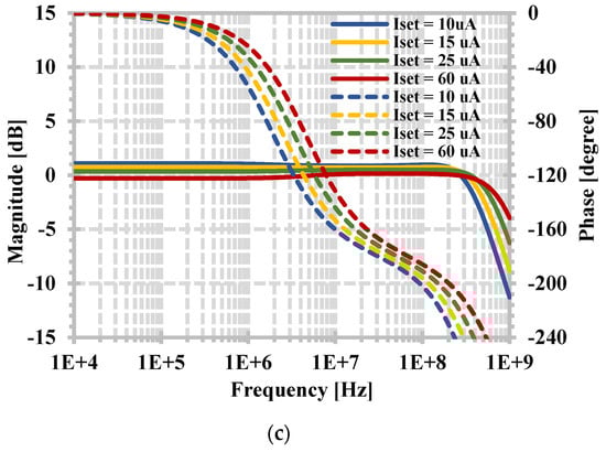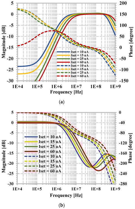 Figure 7 shows the simulated magnitude frequency responses of the HPF and LPF and the magnitude and phase frequency of the APF when the setting current  (i.e., 10, 15, 25, or 60 μA) was used to vary the pole frequency. This result is confirmed by (7).