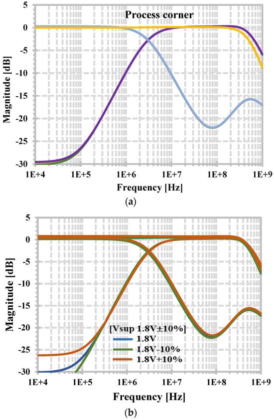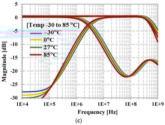 Figure 8 shows the simulated magnitude frequency responses of the HPF, LPF, and APF when several parameters were varied. Figure 8a shows the magnitude frequency responses when the threshold voltage in the CMOS process was varied by 10% (LOT tolerance); the curves are overlapped here. A Monte Carlo analysis with 200 runs was used for simulation and some simulated magnitude frequency responses were selected to be shown. This is used to represent a process variation. Figure 8b shows the magnitude frequency responses when the supply voltage was varied by ±10%, and Figure 8c shows the magnitude frequency responses when the temperature was set to −30, 0, 27, and 85 °C. Thus, the process–voltage–temperature (PVT) of the proposed filter can be confirmed by Figure 8.