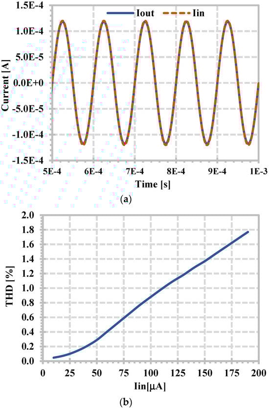 The linearity of the proposed filter was investigated. The LPF with the 2.85 MHz cut-off frequency was selected, and the in-band input frequency of 10 kHz was applied. Figure 9a shows the input and output waveforms of 120 µA for 1.09% of total harmonic distortion (THD). Figure 9b shows the overall THD against the amplitude of the input signal. Figure 10 shows the equivalent output current noise of the LPF. The integrated output noise in the 2.85 MHz bandwidth was calculated to be 13.45 nA, giving a dynamic range (DR) of 75.99 dB.