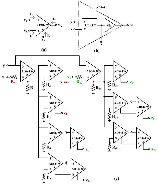 AD844 IC: (a) symbol, (b) internal structure, and (c) realization of the EX-CCCII using the AD844 ICs.