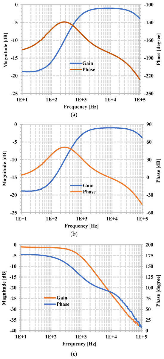 In the case of the TAM and VM ( is used for converting the input voltage  to the input current ), the magnitude at the passband frequency of the HPF is slightly lower than a unity gain (0 dB). The effect of the intrinsic resistance  should be considered for applications, i.e., . The lower unity gain of magnitude at the passband frequency of the HPF will also slightly affect the magnitude of the APF at a higher frequency than the pole frequency.