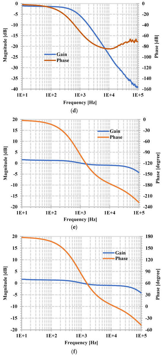 The measured frequency characteristics of the HPF, LPF, and APF with resistor settings  = 5 kΩ are shown in Figure 16. The measured natural frequency was 0.87 kHz, while the designed pole frequency of the filter was 1.17 kHz.