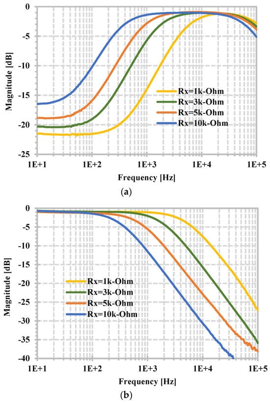 From (7), the pole frequency can be varied by  (). Figure 17 shows the measured magnitude frequency responses of the HPF, LPF, and APF when the resistances  and  () were set to 1 kΩ, 3 kΩ, 5 kΩ, and 10 kΩ. By setting the resistor’s values to 1 kΩ, 3 kΩ, 5 kΩ, and 10 kΩ, the measured pole frequencies were 4.6 kHz, 1.5 kHz, 0.87 kHz, and 0.39 kHz, respectively, while the filter’s designed pole frequencies were, respectively, 5.89 kHz, 1.96 kHz, 1.17 kHz, and 0.58 kHz. This experimental result can be used to confirm the tuning capability of the proposed first-order filter expressed in (7). However, the measured pole frequencies and the designed pole frequencies are slightly different, which is the effect of the IC AD844’s gain error.