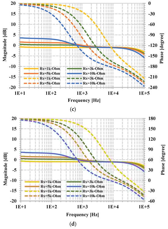 Measured frequency responses with different values of Rx for the (a) HPF, (b) LPF, and APF: (c)  (AP+), and (d)  (AP−).