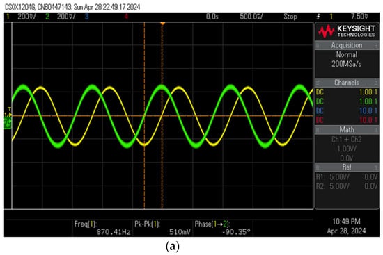 Figure 18 shows the measured transient responses of the APF with setting resistances = 5 kΩ. This shows the phase difference of about 90 degrees at the pole frequency of the input and output signals. The measured pole frequency was about 0.87 kHz. The experimental results in Figure 16, Figure 17 and Figure 18 show that the proposed VM first-order filter can provide non-inverting and inverting HPFs, LPFs, and APFs. This confirms the functionality of the proposed filter.