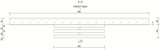 The determination of the geometric parameters of the section transformed into the timber of CLT layers with the grains oriented parallel to the longitudinal axis of the member was carried out at the first stage of the design process. The widths of all the layers, excluding the mentioned ones, should be multiplied by the reduction factor equal to the relation of the moduli of elasticity of the considered layer to the modulus of elasticity of the timber of the CLT layers parallel to the grain direction. An example of the transformed section obtained for the TCC beam-type panel, considered in the current study, is shown in Figure 2.