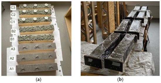 The second group of laboratory specimens: (a) designations of specimens in the sub-groups and (b) specimens placed in the moulds in the process of concrete hardening.