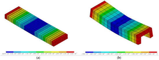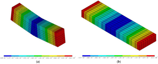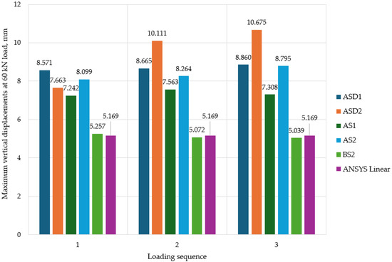 The FEM models with the diagram of the vertical displacements of the second (sub-group B) and third (sub-group BS) specimens’ groups are shown in Figure 10 under the action of the concentrated force applied in the middle of the span as well.