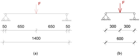 The first and third groups of specimens have a total length of 1400 mm and a width of 400 mm. The parameters are joined with the possibilities of the testing device (CONTROL model 50-C1400/*), which enables testing by the scheme of three-point bending specimens with a maximum span of 1300 mm. The second group of specimens has a length and width equal to 600 and 100 mm, respectively. The parameters are also joined with a testing device (FORM+TEST UPB 86/200), which enables testing by the scheme of three-point bending specimens with a maximum length of 600 mm and span of 500 mm (Figure 8). The specimens were supported by steel pipes with square cross-sections and dimensions of 100 mm × 100 mm. It enables us to avoid local deformations on the support zone of the specimens during their loading.