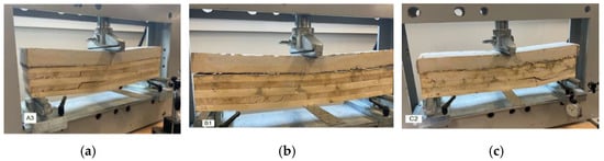 The failure modes of the specimens of all three sub-groups of the second group: (a) first sub-group (specimen A3), (b) second sub-group (specimen B1), and (c) third sub-group (specimen C2).