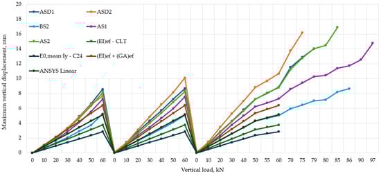 The dependences shown in Figure 12 enable us to evaluate the influence of the shear force on the values of the maximum vertical displacements obtained by the analytical calculation. The actual values of load-carrying capacities of specimens 1 and 2 of the 1st sub-group of the 1st group of the specimens were equal to 66 kN and 54 kN, respectively. It is 57.8% and 38.9% higher than the design value determined by the simplified design method. The dependence of the maximum vertical displacements on the vertical load, applied as a concentrated force in the middle of the span, for the 2nd sub-group of the 1st group of the specimens, supplied by the glued laminated timber ribs, is shown in Figure 13.