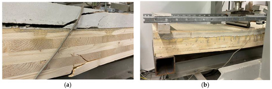 A significant difference between the modes of failure of the specimens of sub-groups AS and BS was observed (Figure 17). The mode of failure for the sub-group BS is characterised by the collapse of the CLT and concrete components. The disintegration of the specimens caused by the delamination of the concrete layer due to the collapse of the adhesive timber-to-concrete connection was also observed.