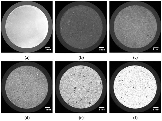 The X-ray CT imaging was performed on nano-voxel 3000H X-ray micro-CT equipment manufactured by Tianjin Sanying Precision Instruments Co., Ltd. (Tianjin, China). During imaging, region c of the samples, as shown in Figure 1, was positioned at the center of the detector, with a part of the standard aluminum sample also within the field of view. The source-to-object distance (SOD) was 47.36 mm, the source-to-detector distance (SDD) was 816.86 mm, and the detector pixel size was 127 μm. The effective projection image pixel size was 7.363 μm. Prior to the experiment, 10 flat fields were collected to facilitate background subtraction before the reconstruction of CT slices. For samples 2–6, containing iron powder, the X-ray tube operated at 130 kV and 80 μA. Two projections were collected for every 0.25 degree of rotation of each sample, and the exposure time of each projection was 2 s. Each pair of two projections captured at the same projection angle were merged into one frame to reduce random noise. Each sample was rotated 360 degrees, and a total of 1440 projection frames were collected. A 0.5 mm thick Cu filter was placed directly at the X-ray exit to reduce beam hardening effects. For sample 1, composed of pure silica, an X-ray tube voltage of 80 kV and a 0.5 mm thick aluminum filter were used to ensure optimal imaging contrast. Three projections were collected for every 0.25 degree of rotation of sample 1 and merged into one frame to minimize the random noise. Other CT imaging parameters of sample 1 were consistent with samples 2–6. After acquiring the projections of the samples, X-ray CT slices with 32-bit floating-point format were reconstructed using VoxelStudio Recon software (version 2.5.1.25), which was supplied with the CT instrument. The pixel values of the reconstructed CT slices are the X-ray attenuation coefficients. Figure 2 is typical CT slices of the samples.