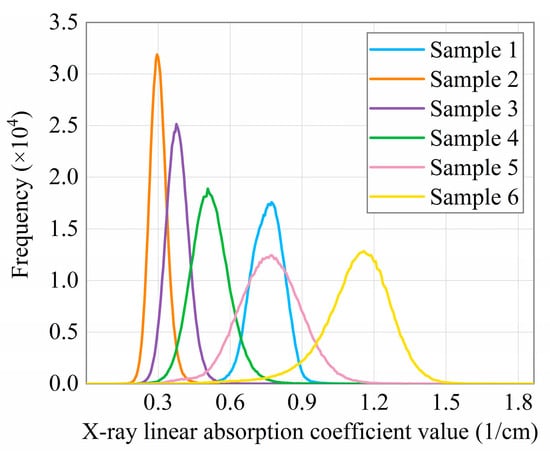 In order to avoid the influence of pixels outside the sample boundaries, six sub-regions of 800 × 800 pixels were selected from the CT slices in Figure 2 for statistical X-ray linear absorption coefficient histograms of each sample. As shown in Figure 3, the histograms exhibit clear single-peak characteristics for all six samples. For CT slices of samples 2–6 with identical imaging parameters, the peak height of the gray value distribution decreases, and the corresponding X-ray linear absorption coefficient value and the width of the peak increase with the increase in iron content in the samples. The decrease in peak height and increase in peak width indicate that the partial volume effect in the sample increases with the iron content. The histogram of sample 1 shows a wide peak, indicating that the pores and silica in the pixels in most areas of the CT slice exist in the form of co-occupying the pixel.
