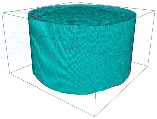 The volume fractions of the compositions in region c of the samples were calculated for quantitative comparison with the DCM calculation results. A built-in sample boundary detection algorithm in the DCM software (version 2.6.3.2663) [] was used to extract the regions corresponding to region c of the samples. Figure 4 shows the three-dimensional boundary of region c of sample 1. The quantities of CT voxels included within region c of each sample were statistically analyzed to determine the physical volume corresponding to each sample’s region c based on the sizes of individual CT voxels. Figure 4 shows that the top of sample 1’s region c has a ring-shaped protruding edge. This is due to the uneven force applied during the sample preparation process. To accurately determine the volume fractions of the compositions in the samples, these protruding edges were included in the total volumes of sample region c. Combined with the mass and density of each composition added to region c during preparation, the volume fractions of different compositions in each sample were calculated, as shown in Table 2.