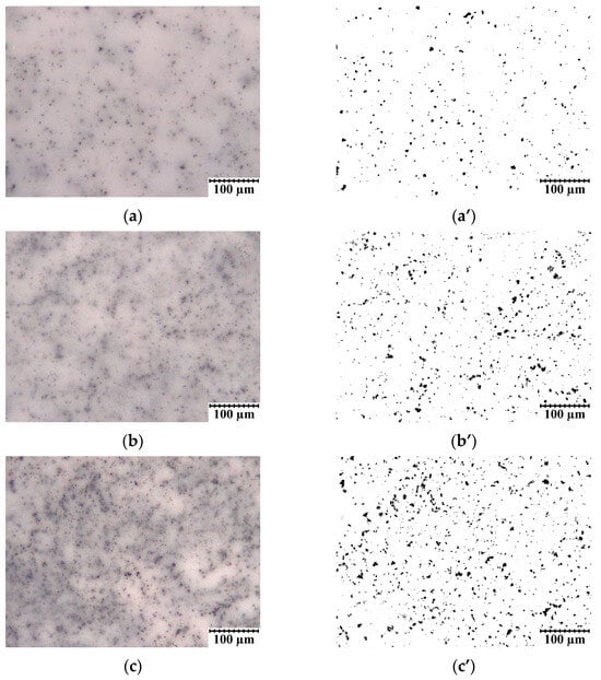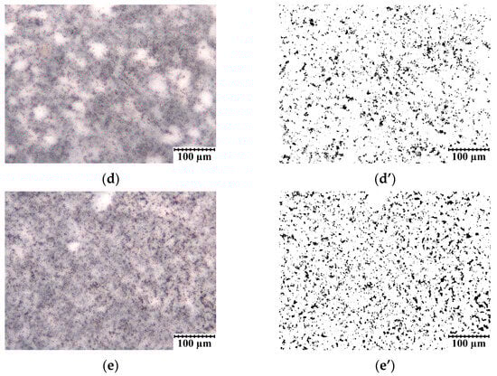 Optical microscope images (a–e) and the threshold segmentation results (a’–e’) for samples 2–6. The pixel size of each image is 2560 × 1920 pixels, and each pixel represents a physical size of 0.206 × 0.206 μm2. (a,a’) Sample 2; (b,b’) sample 3; (c,c’) sample 4; (d,d’) sample 5; (e,e’) sample 6.
