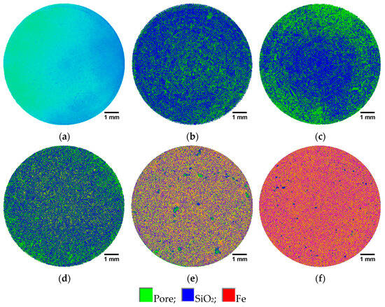 As shown in Figure 6a, most areas are mixed colors of blue and green, indicating that pores and silica mostly exist in the form of partially occupied pixels. In Figure 6b–d, the color of red corresponding to iron composition is less visible, primarily due to its lower volume fractions in these three samples, where its color is masked by others. Figure 6d shows some yellow areas, suggesting the coexistence of iron and pores in those regions. A large number of light red regions are clearly visible in Figure 6e,f, corresponding to the high volume fractions of iron in samples 5 and 6. However, areas displaying as 100% red are relatively scarce, indicating that iron in these samples also occupies voxels partially. Furthermore, an increase in iron particle volume fractions may lead to an increase in X-ray linear absorption coefficients of voxels around them due to metal artifacts and point spread functions, potentially resulting in an overestimation of iron content in the calculations. In Figure 6a–c, some compositions exhibit a ring-shaped distribution form, which is more likely caused by the ring artifacts present in the CT slices of the samples, as shown in Figure 2. Despite our efforts to improve CT imaging quality through methods such as background subtraction and the use of filters, there may still be unavoidable image artifacts present in the CT slices, such as ring artifacts, motion artifacts, and beam hardening artifacts. These image artifacts may also reduce the accuracy of the DCM calculation results, and it is difficult to obtain a quantitative assessment of their impact on the accuracy of the DCM calculations.