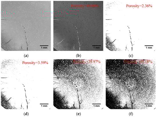 Typical X-ray CT slices of the samples. (a) Sample 1; (b) sample 2; (c) sample 3; (d) sample 4; (e) sample 5; (f) sample 6.