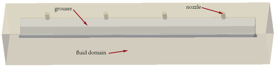 Before numerical simulation, a geometric model was created in SOLIDWORKS (2024), followed by importing it into ICEM (v.19.0) for structured meshing, The mesh type was a hexahedral unstructured mesh. Subsequently, the simulation analysis was conducted using ANSYS Fluent software (2024 R1) to validate the accuracy and reliability of the simulation. The three-dimensional computational domain is shown in Figure 1. The model is accurately built based on the real dimensions of a deep-sea mining vehicle’s walking track teeth, and a previous simulation study showed that the jet velocity begins to decline rapidly at around 0.31 m for a 30 mm diameter linear nozzle. To handle the jet’s core efficacy region, the simulation analysis used a distance of 0.16 m between the nozzle injection point and the root of the tooth and the dimensions of the nozzle flow field measuring 1.8 m × 0.3 m × 0.3 m (length × width × height). This precise parameter selection was intended to maximize cleaning efficiency while optimizing energy consumption during the cleaning procedure.