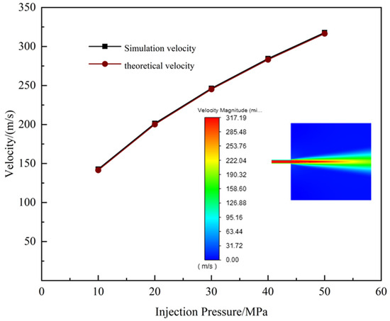 where is the fluid velocity, is the flow coefficient, is the inlet pressure, and is the fluid density. Under a 10–50 MPa injection pressure, Figure 3 compares the theoretical and simulated velocities of nozzles with different injection pressures and simulation plots of the jet velocity distribution at 50 MPa. The results reveal that theoretical and simulated velocities agree well, and numerical simulation results are accurate.