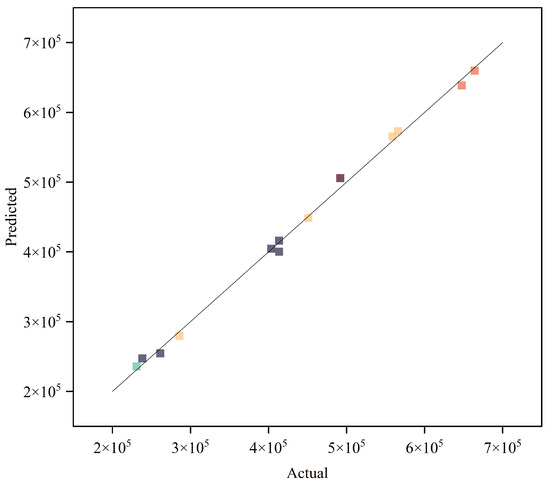 Table 4 presents the ANOVA results of the model, with the p-value indicating the significance of the factor. A p-value less than 0.001 is highly significant, while one that is generally less than 0.05 is considered significant. The results in Table 4 reveal that the p-value of the regression model is less than 0.0001, signifying the high significance of the response surface model and the regression effect [18,32]. The single-parameter analysis demonstrates that the p-values of regression terms and are less than 0.0001, highlighting the highly significant effects of jet pressure and target distance on the pressure of the jet striking the track tooth. The p-value of is 0.0017, indicating that the effects of jet angle on the pressure of the jet striking the track tooth are significant; the two-parameter analysis shows that the p-values of the combinations and are 0.0472 and 0.0264, respectively, which are distributed in 0.001 < p-value < 0.05, indicating that the effect of two two-parameter combinations on the jet striking the tracked teeth’s pressure is significant. From the F-value, it can be seen that the order of influence on the pressure of the jet striking the track tooth is > > . The quality of the regression model was assessed by the linear regression coefficient of determination, coefficient of variation, signal-to-noise ratio, and the sum of squares of forecasts [33]. The coefficient of variation CV = 2.45%, indicating that only 2.45% of the total variation cannot be explained by this model. The signal-to-noise ratio is 52.8. Refs. [32,34] indicates that when the model coefficient of variation is less than 10 and the signal-to-noise ratio is greater than 4, the model fits with a high accuracy and good reproducibility. The established response prediction model in this study is proven to be reliable in describing the response law of jet striking tracked teeth.