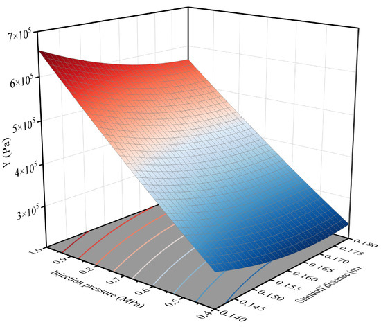 Figure 6 illustrates the relationship between the injection pressure, injection target distance, and strike pressure of the tracked teeth. The graph shows that the peak striking dynamic pressure occurs at 1 MPa and 0.14 m. Notably, the maximum striking dynamic pressure is achieved at 1 MPa. Moreover, when the spray angle is 75°, the strike pressure of the jet on the tracked tooth increases as the spray pressure rises, while the impact of the spray target distance on the strike pressure of the jet is less pronounced. The steepness and significant slope of the response surface suggest a strong interaction between jet pressure and jet target distance.