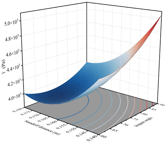 The impact of the interaction between injection pressure and impact angle on the dynamic pressure of the striking track tooth ( = 0.16).