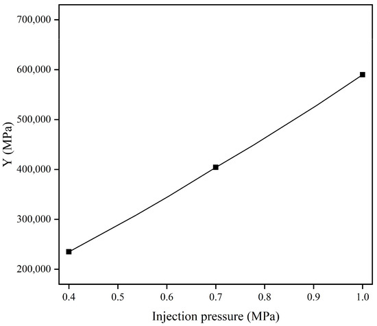 Figure 9 illustrates the correlation between the jet strike track tooth pressure and the injection pressure. The graph shows a linear increase in jet strike track tooth pressure as injection pressure rises. It is observed that the maximum jet strike tooth pressure occurs at a jet pressure of 1 MPa. The utilization of an elevated jet pressure improves the efficacy of cleaning and decontamination processes; however, it concurrently results in heightened energy consumption. Hence, selecting an appropriate jet pressure is crucial to achieving the desired jetting effect.