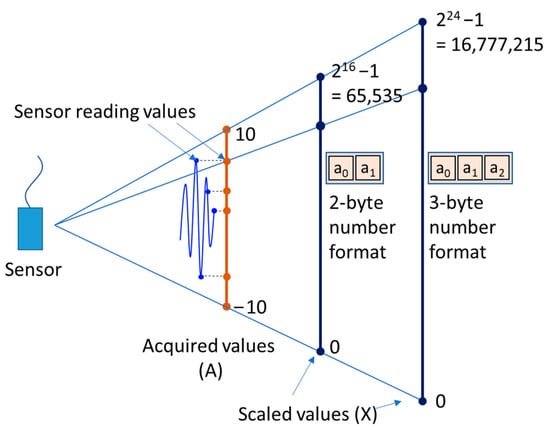 The ISO/IEC 60559:2020 [] (IEEE 754 [,]) standard is the most widely used for representing real numbers in binary form. This standard defines different binary encoding algorithms that can represent real numbers in large ranges, thereby enabling the storage of a wide range of sensor reading values. However, this may not be the most efficient method of encoding sensor reading values, as these values typically have a limited range for each measuring channel. For instance, sensor reading values are generally acquired as real numbers with a range of ±10 V (voltage) or 4–20 mA (current), depending on the specification of the DAQ device employed. In addition, each DAQ device has a specific measurement resolution that limits the number of measurement values []. Using standard algorithms to store sensor reading values can lead to the wastage of storage resources. To optimize data storage, data-encoding algorithms should be specialized with respect to the characteristics of the target values. This approach ensures that the required memory is minimized.