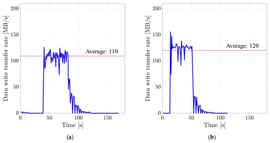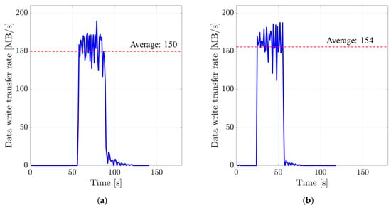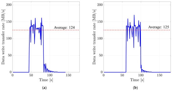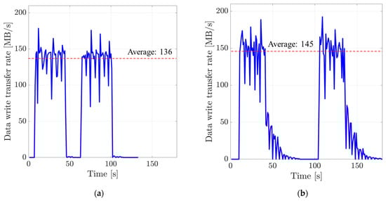 In this study, the buffer sizes were selected as powers of two, such as 512, 256, or 128 MB, for ease of implementation. However, the tests showed that the difference in the data write rates between the 130 MB and 128 MB configurations was not remarkable. Therefore, it is not mandatory to use a buffer size with a power of 2, as the write rate increases regardless of the buffer size. Additionally, for every configuration in each approach, the writing test was conducted multiple times. There was no remarkable difference between the average write rates of these tests and those described in Table 2. This stability is attributed to the 5 GB of data used in each writing test, which was sufficiently large to ensure generalization.