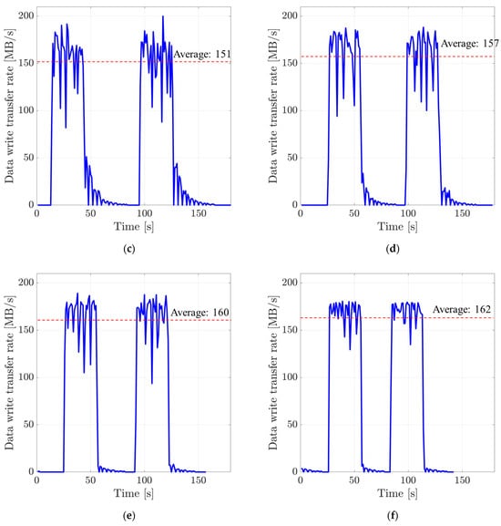 Data write performance of tests using a self-created buffer. (a) Buffer size = 8 MB, (b) buffer size = 32 MB, (c) buffer size = 64 MB, (d) buffer size = 128 MB, (e) buffer size = 256 MB, and (f) buffer size = 512 MB.