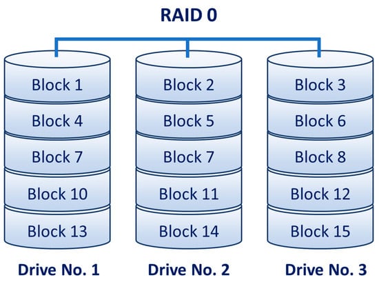 In computer science, a technology called the redundant array of independent disks (RAID) combines two or more hard drives. Various RAID levels are available, with RAID 0 offering the best performance. Accordingly, the data are divided into blocks and alternatively written across multiple drives simultaneously, as shown in Figure 8. This technique significantly reduces the write latency, leading to a significant boost in the write performance. A combination of two similar drives with RAID 0 offers twice the write rate and double the capacity of a single drive. With three similar drives, the achievement triples, and so on.