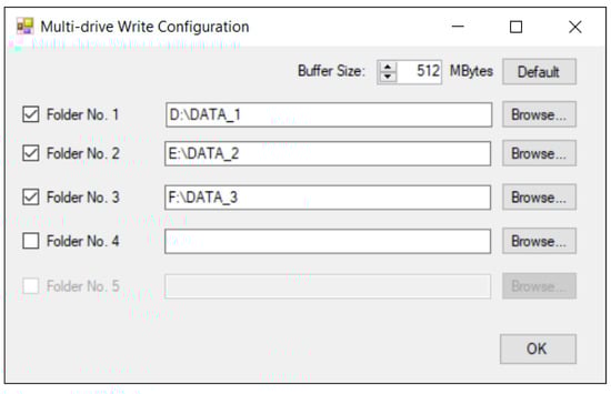 - Store data. The NI-9223 module type has a 16-bit resolution, making the 2-byte number format recommended for storing the measured data. However, the 3-byte number format was selected to verify the capabilities of the program. This format provided a 24-bit resolution that was greater than that of the DAQ devices. It did not make sense to improve the accuracy of the stored values but instead increase the amount of data generated for testing. The actual input range of ±10.7 V was set. As configured, this system acquired 56 mega-samples every second for all channels, producing 168 MB of data every second, thereby requiring a write rate of at least 168 MB/s.The average data write rates of the three HDDs were reported in Section 3 as 162, 172, and 138 MB/s, respectively. Therefore, only HDD #2 supported the required write rate and was selected to store the data. The target buffer size was set to 512 MB to maximize the write performance. The program automatically calculated and then applied an appropriate buffer size of 508 MB, which was closest to the target size. With this configuration, the buffer was filled every 3 s, and the entire dataset was written into the hard drive. The configuration for obtaining the measurements performed well.Another setting was also tested. Now, a combination of HDDs #1 and #3 was selected to store the data instead of HDD #2. A multidrive write was used for this measurement. The other parameters were configured as those for the previous test. This test was well implemented and successfully wrote the data into multiple files located across HDDs #1 and #3, even though neither drive could individually support the required write rate.